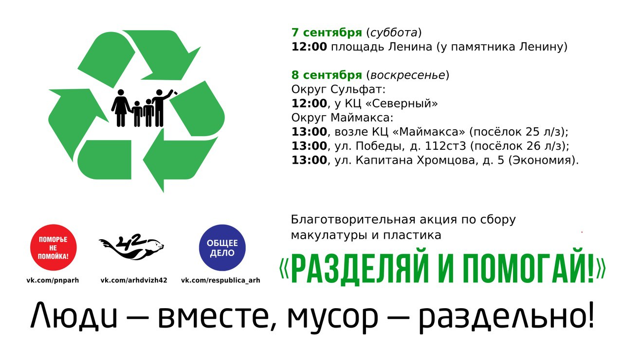Завтра на центральной площади Архангельска, а в воскресенье — на Сульфате и в Маймаксе — пройдут акции, на которых активисты будут принимать вторсырьё. Средства, полученные от его реализации, пойдут на благотворительность.