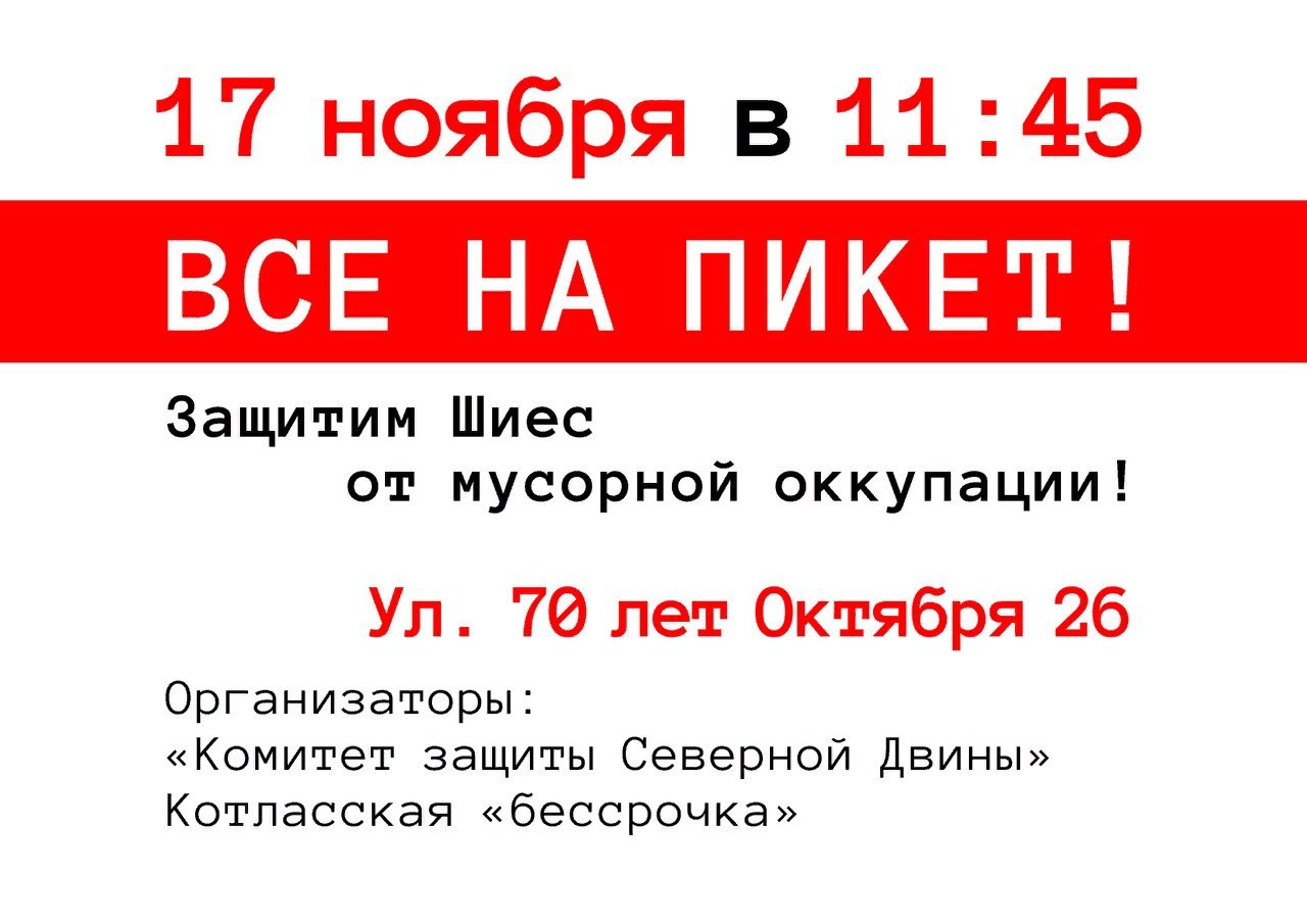 ​​17 ноября (воскресенье) в 11:45 в Котласе пройдёт массовый пикет в защиту Шиеса. Место встречи: территория рядом с пешеходным переходом по адресу: ул. 70 лет Октября, д. 26.