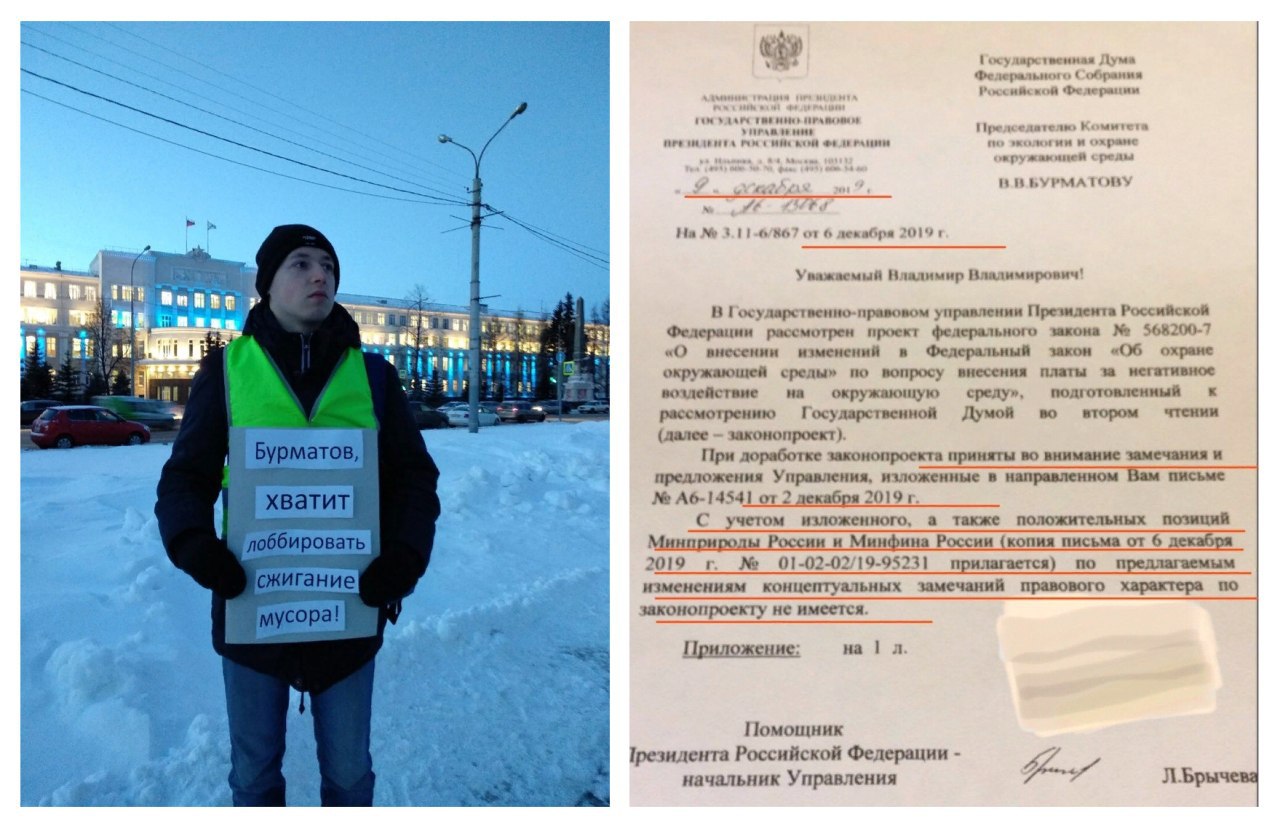В областном центре прошли одиночные пикеты против введения поправок, приравнивающих сжигание отходов с попутной выработкой электроэнергии к переработке мусора.