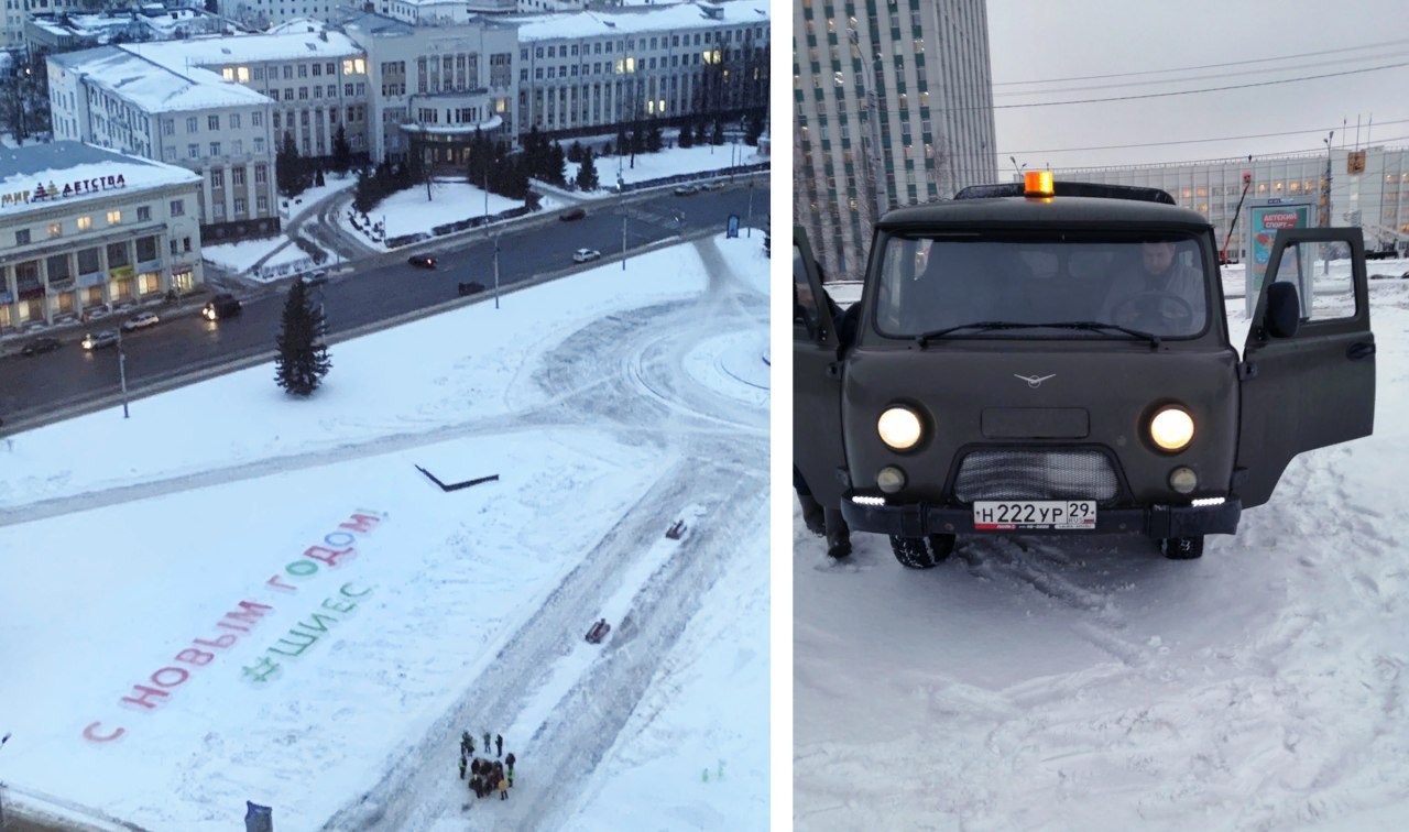 15 декабря на площади Ленина в Архангельске недалеко от поста №5 (бессрочка) появился шедевр «снегопечати» — новогоднее поздравление Шиесу.