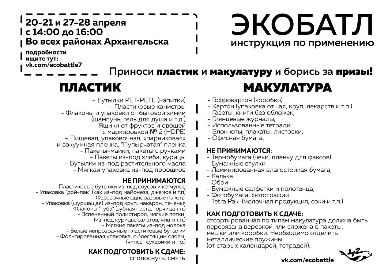 Приносите макулатуру и пластик на ближайший пункт (что можно сдавать, указано на картинке, прикреплённой к посту). Там вас встретят волонтёры, которые взвесят ваше вторсырье и внесут в турнирную таблицу. Вы можете приносить вторсырье на протяжении всех дней работы пунктов. Участвовать можно индивидуально (с 14 лет) или командой.