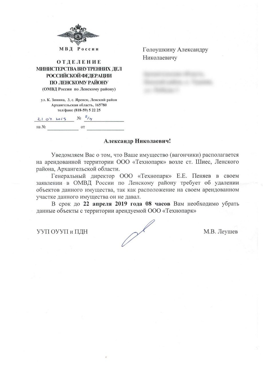 Сегодня на имя владельца имущества пришло письмо из отделения полиции по Ленскому району с требованием в срок до 8 утра завтрашнего дня убрать объекты (вагончики) с территории, арендуемой «Технопарком».