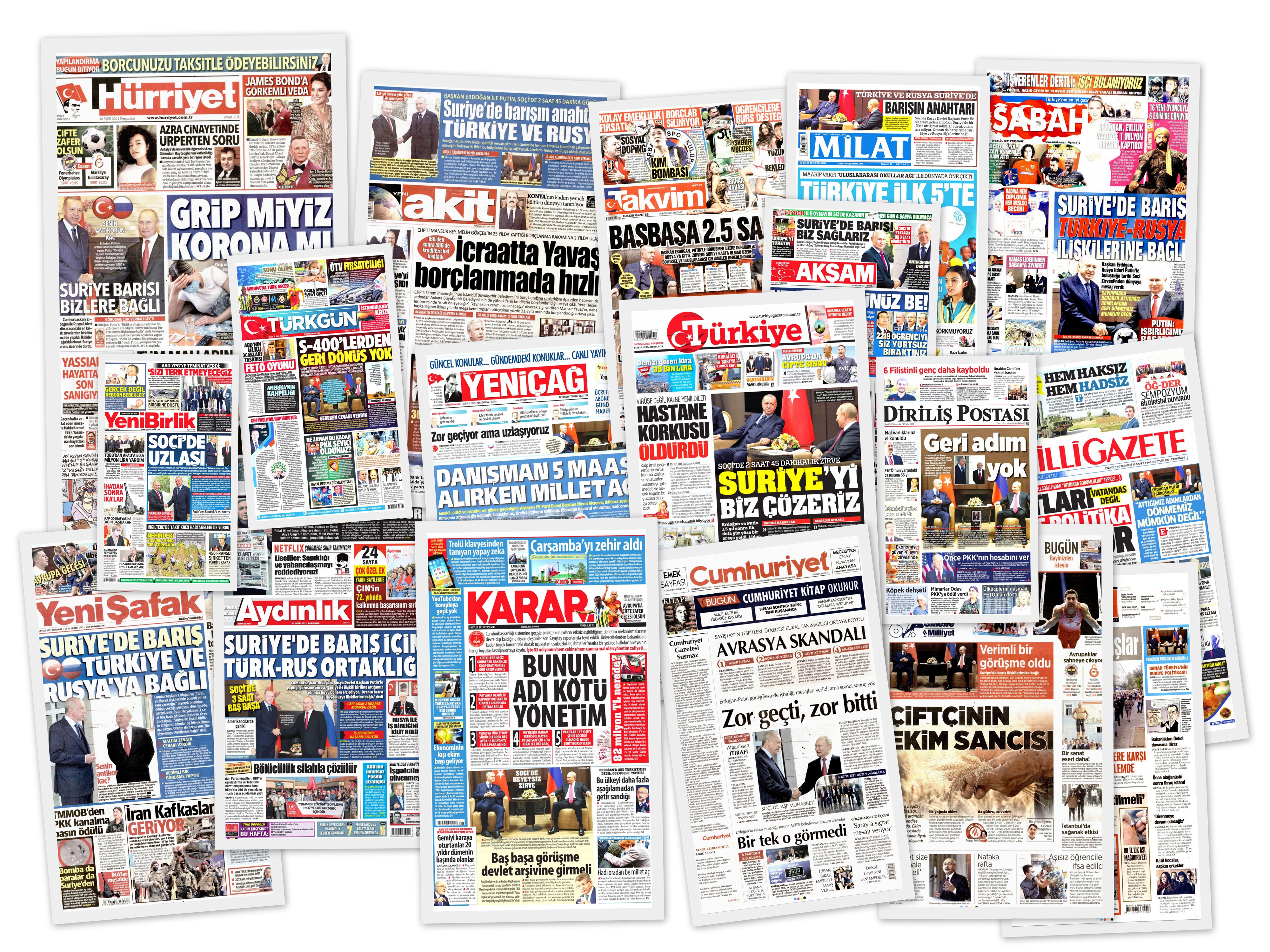 Готовлю первые полосы турецких газет на тему вчерашнего визита Эрдогана в Сочи. Практически все газеты вынесли встречу на первую полосу переговоры Эрдогана и Путина. Каждая газета увидела свою важную новость.
