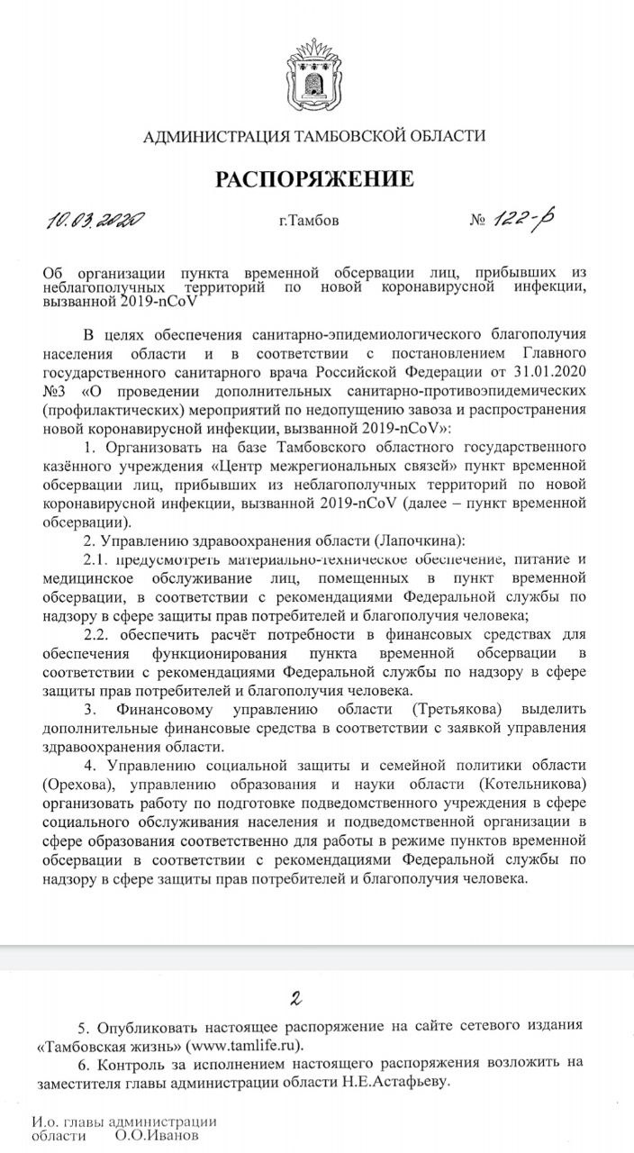 Почему же первый вице-губернатор Олег Иванов перенес центр для лиц в карантине по коронавирусу из деревенского захолустья в практически официальную загородную резиденцию администрации Тамбовской области? Неужели его испугали протесты местных жителей Сосновского района, которые потребовали убрать центр из разваливающегося здания?